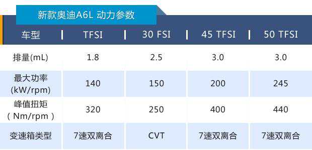 传动方面,新款奥迪A6L的增压车型均将匹配7速双离合变速箱。而自然吸气版本车型则继续搭载可模拟8个档位的CVT变速箱。