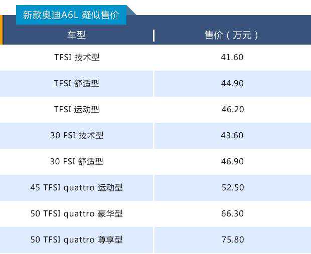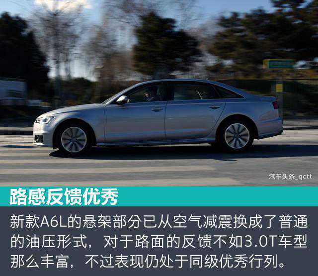 动力方面,新款A6L将由一款1.8T发动机取代现款车型所采用的2.0T发动机,新车型的入门排量虽有所降低,但与最大功率为132kW的2.0T发动机相比,动力不降反提高8kW,扭矩则保持320Nm不变,燃油经济性也得到提升。3.0TFSI低功率版发动机则取代了老款的2.8FSI发动机,功率增大至200kW,零到百公里加速时间缩短为6.5秒。