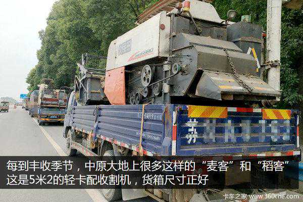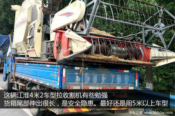 采用4米2车型运输收割机非常勉强,属于不得已而为之。例如这个江淮轻卡,收割机尖锐的部分伸出货箱后面很长,是安全隐患。运输这类收割机最好还是采用5米以上并且带卧铺的车型。