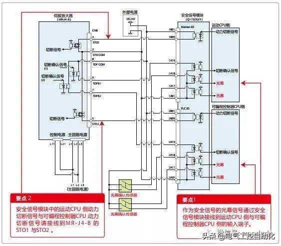 使用安全信号模块时的安全系统接线示例。光幕的信号连接到安全信号模块的输入端子,安全信号模块的输出端子连接到伺服放大器的STO端子。