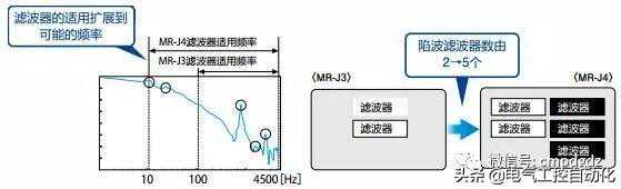 机械共振抑制滤波器:通过提高滤波器构造,将适用频率范围由100Hz~4500H扩展到10Hz~4500Hz。并且,将可同时适用的滤波器由2个扩展到5个,从而提高机械的振动抑制性能。