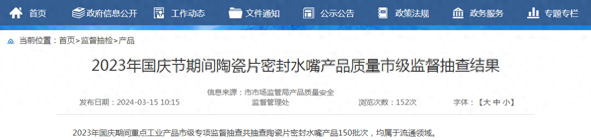 2023年国庆节期间陶瓷片密封水嘴产品质量市级监督抽查结果