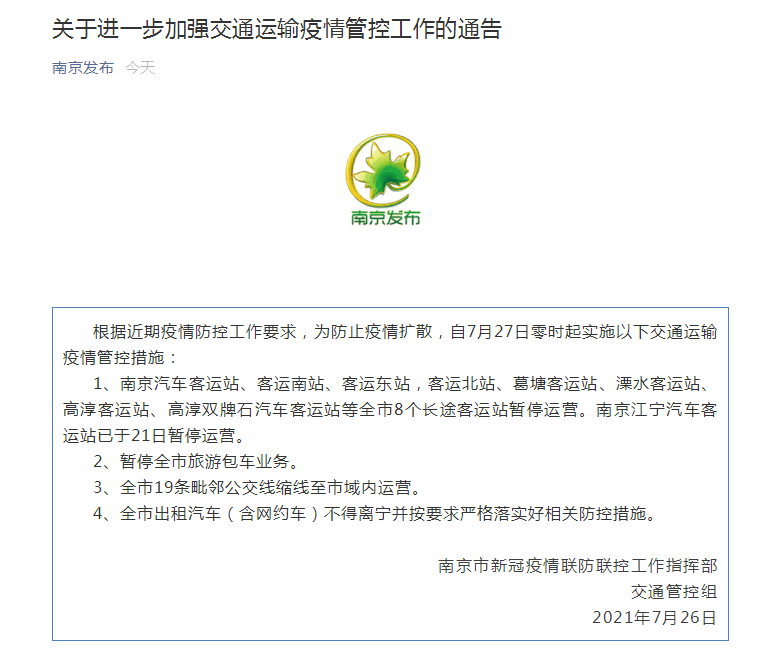根据近期疫情防控工作要求,为防止疫情扩散,自7月27日零时起实施以下交通运输疫情管控措施:
