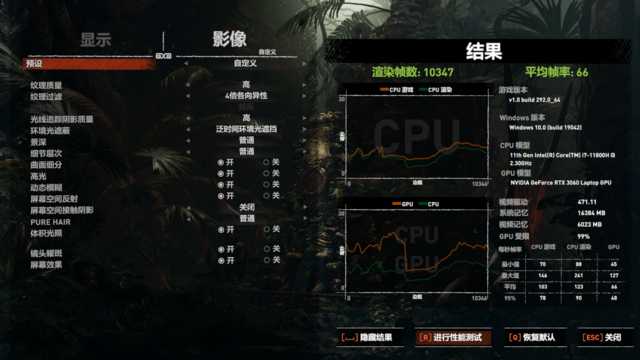 依旧在高特效下,开启光线追踪质量:高。再次进行测试,最后我们得到了平均帧数66的成绩,玩家依然可以流畅玩耍。