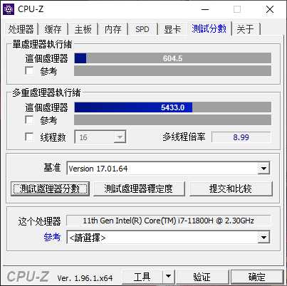 CPU-Z中经典的V17测试,单核604.5,多核5433,这颗酷睿i7-11800H良好的性能表现有目共睹。