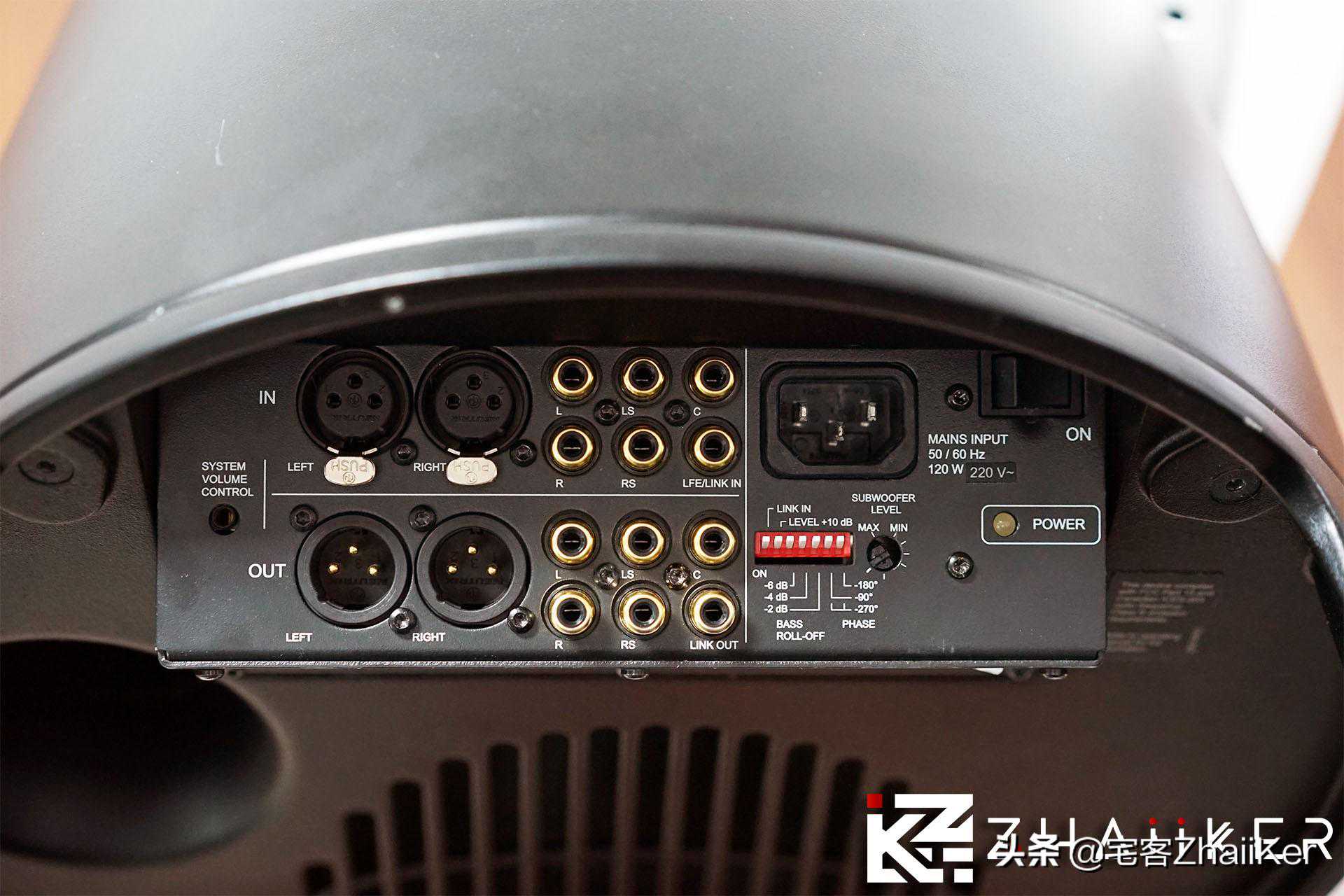 F2整体呈梯形圆柱体形状,外观也展示了真力一如既往简约的风格,在家居搭配中也不会显得特别突兀。所有的接口和操作都在箱体底部,对比起音箱来说,接口要丰富的多,主要分为两部分,一个是输入接口,一个是输出接口,两者均带了RCA接口以及XLR接口,此外,左侧还有SYSTEMVOLUMECONTRAL(系统音量控制),而右侧除了电源接口以及开关外,还有低音炮灵敏度调节(SUBWOOFERLEVEL),可以从MIN控制到MAX,可以调节低音的量感,当然,这得看你客厅的要求来操作,而电子分频控制中有低音炮相位调节(PHASE),分别有-90°、-180°以及-270°三个等级,还有BASSROLLOFF-2dB、-4dB、-6dB等几个等级,剩下两个分别是LINKIN以及LEVEL+10dB的开关。