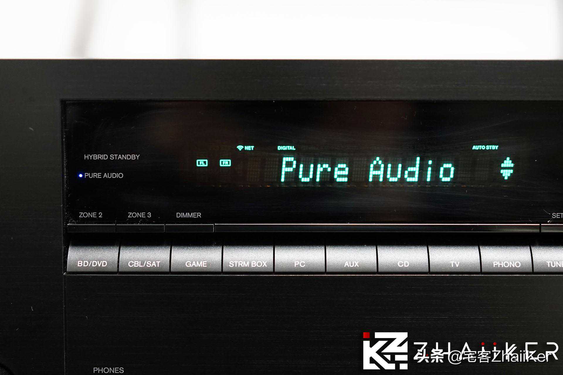 前面板左边上方是开关以及PureAudio模式的按钮,下方是设有独立的聆听模式同音效调节旋钮,可以很方便地调声。