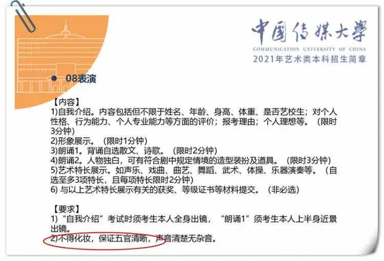 “拍摄一镜到底,不得使用美颜、滤镜等特殊效果镜头,不得剪辑和后期技术处理”“朗诵结束后直接走近镜头至相应位置,使身体在镜头中呈现出中近景效果,面向镜头、左右各90度侧向镜头分别停顿五秒后结束拍摄”“考生不得整容、化妆,女生需将头发扎起,清晰露出五官”;甚至为了防止考生利用拍摄角度美化身高、形体,简章还规定:“男女统一穿着黑色紧身练功服并赤脚,脚边放置农夫山泉550毫升普通装矿泉水一瓶”。