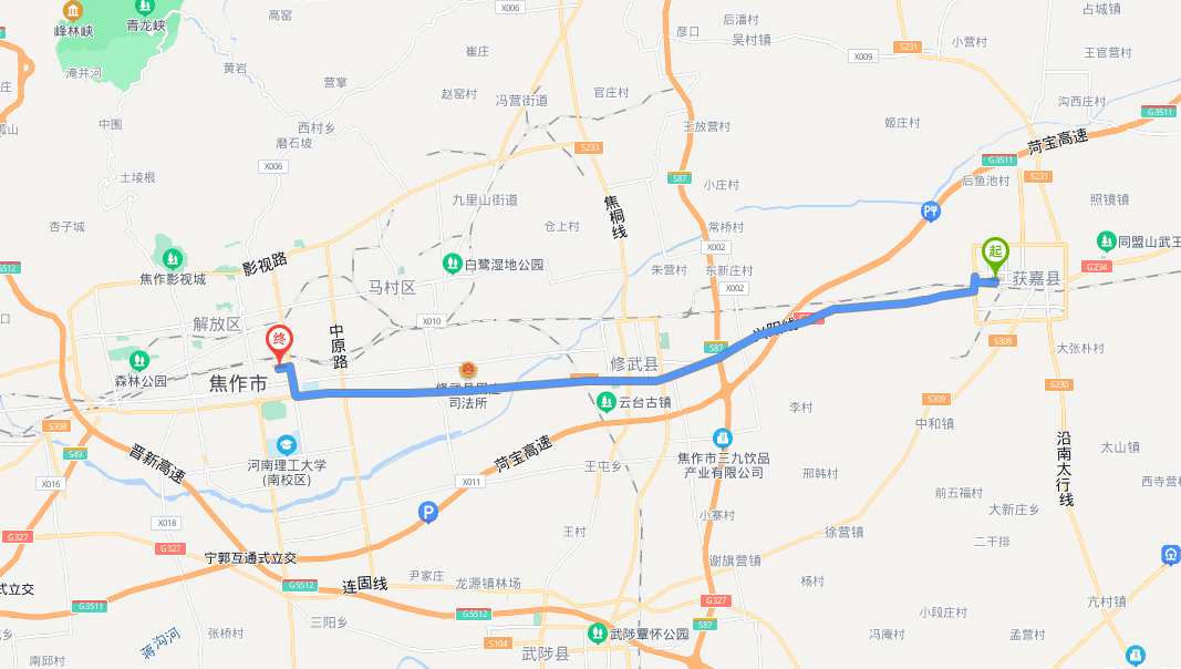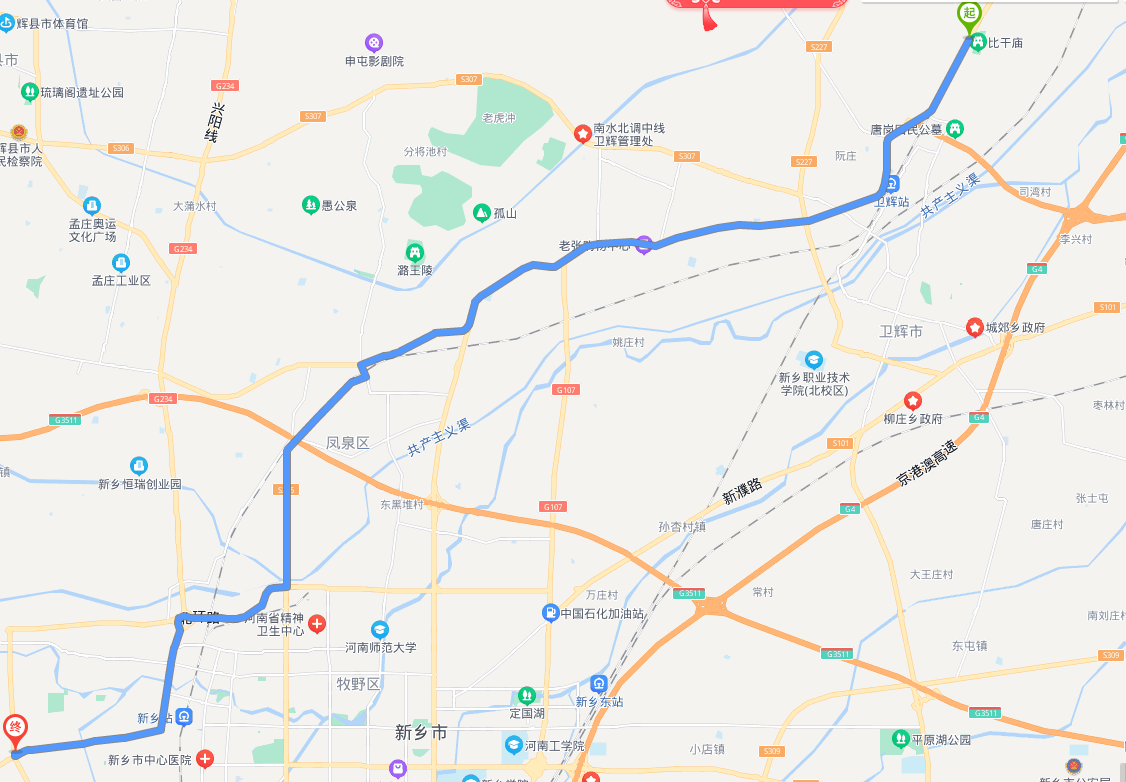 下面是新乡市到获嘉县的路线,大概13.5公里。