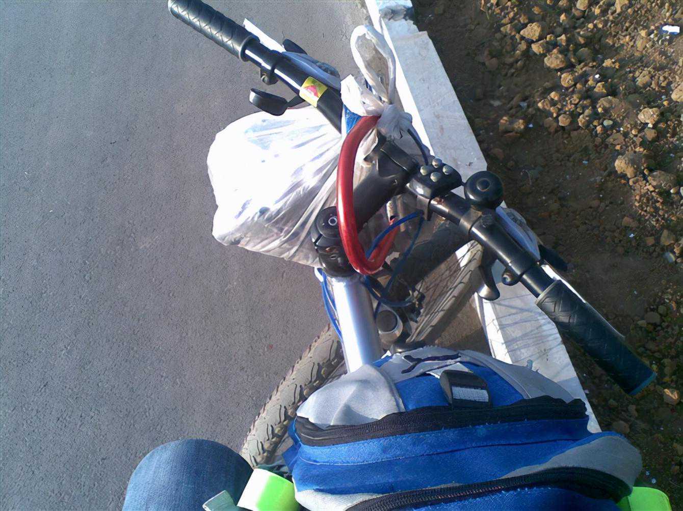 这时候整个人跟行尸走肉一样快崩溃了,就是数着路边的墩墩在走。背包里没有多少东西,但是肩膀酸痛,不得已直接绑到车把上,出奇的轻松。所以说装个后货架还是非常有必要的。手也又酸又麻,只能不停变换手的握把姿势。副把如果有那是极好的。这段路算是我最难熬的了,每次休息后上车,根本骑不了多久就又想下车休息,真心累。就靠数路边的白色桩子,一公里一公里的爬,每数9个桩子就走了一公里。