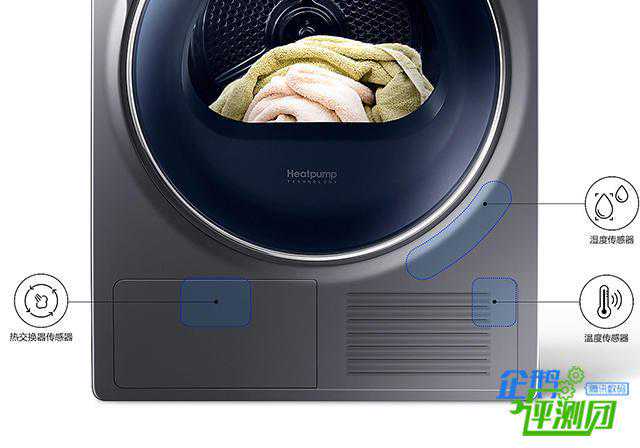 机身上方为平面设计,不仅可以与三星同品牌洗衣机叠加放置,为居室节省出更多空间,平时还可以放一些轻便的物品,来节省空间。机身的正面分为上中下三层,上方为控制区域,中间为舱门,底层为主要的三个感应器:热交换传感器、湿度传感器、温度传感器。由于干衣的过程中不能开门检查,所以它通过这三种传感器,构成一套智能干衣系统,实时监测衣物的干燥度,确认衣物已被烘干后会自动终止程序,降低能耗,贴心呵护面料。