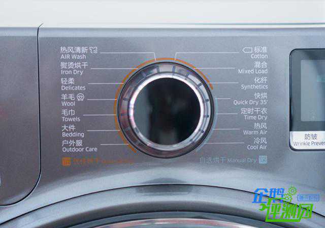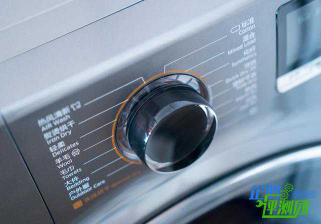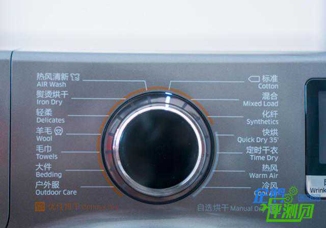 机身上方的中间和右侧位置则为整个干衣机的控制面板了,其中左侧为操控旋钮以及程序选择菜单,右侧为显示控制面板以及电源键和开始暂停键。其中操控旋钮材质类似于水晶的质感,旋钮的阻尼适中,回馈清晰明确,使用起来非常灵活但又不会容易产生误操作。
