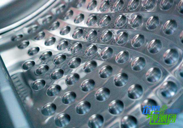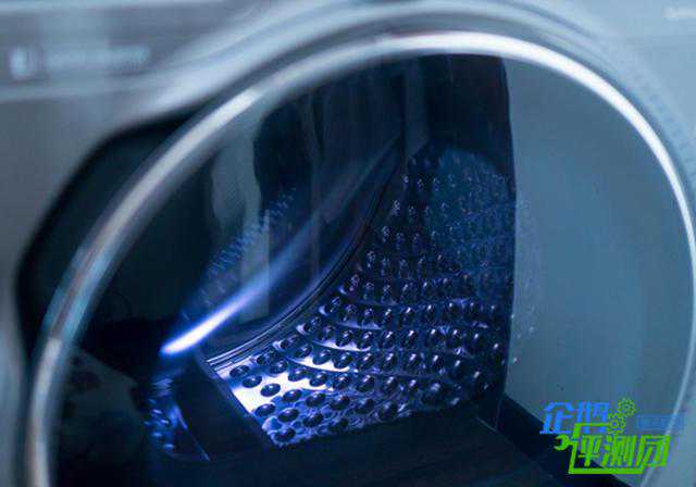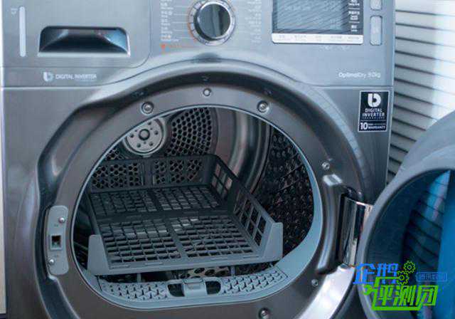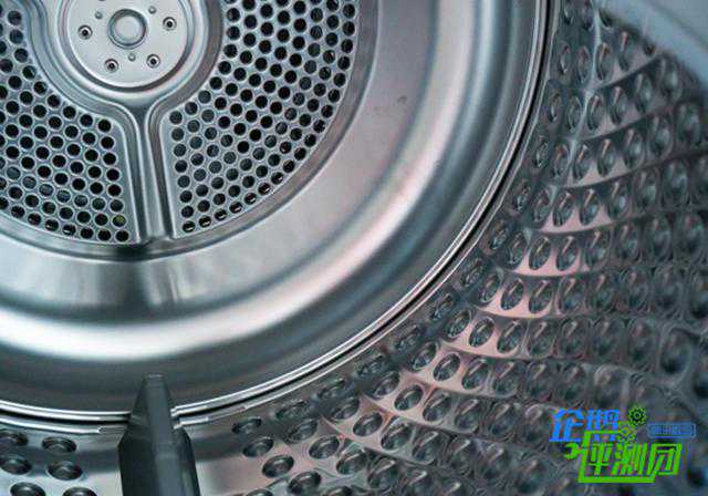 打开机身的舱门,可以看到内部硕大的滚筒,和外观一样,内筒乍一看也和洗衣机的内筒有几分相似之处,只不过干衣机的筒底密布网孔而筒壁采用无孔的设计。