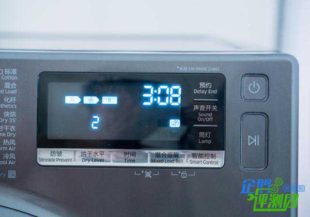 通电之后,操控旋钮的指示灯亮起,可以看到当前选择的烘干功能。三星为该款干衣机提供了14个烘干程序,其中10个优佳烘干程序,系统自动设定,打造出极致的烘干效果;4个自选烘干程序,让用户自行设定,使用更为方便,丰富的程序设计加上前面说到的三大传感器的协作,即使在干衣机内部同时放衬衫、羊毛衫、真丝睡衣等不同材质的衣物,它也能根据衣物烘干程度来自动调整烘干时间,这个是其它干衣机很少具备的功能。