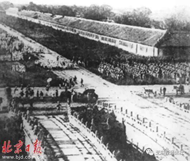 1900年8月14日,八国联军进北京在天安门前举行占领皇宫的仪式,图中可见千步廊和金水桥。资料图。