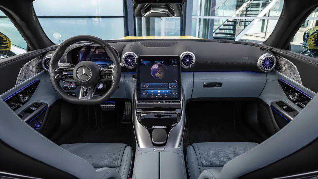 奔驰车的内饰你永远不需要担心,AMGGT43同样如此。在整体风格上,AMGGT43与SL系列大致相同,均采用游艇环抱式座舱,搭配竖向11.9英寸中控屏,车内有着非常严谨的对称式造型,相当规整。另外,AMG标志性的三幅式运动方向盘,以及方向盘上的两个自定义旋钮,也都出现在了AMGGT43上。