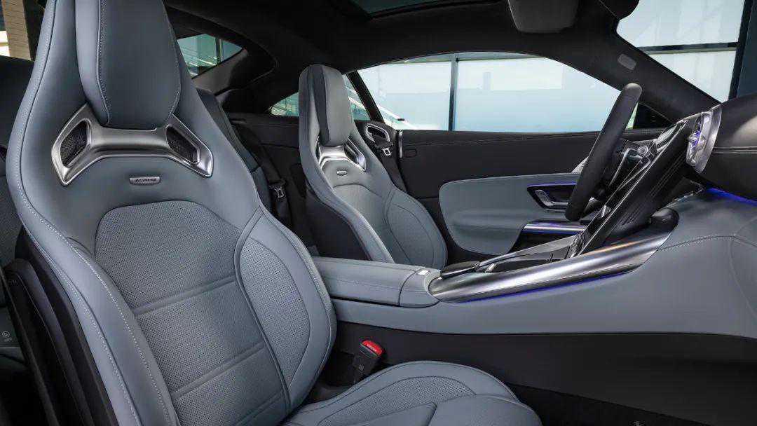 作为一辆GT跑车,AMGGT43采用了2+2的4座布局,前排两张座椅采用一体式运动风格,但表面有大面积的打孔皮质覆盖,颈部还有金属镂空造型,整体对于舒适性和包裹性的平衡是比较到位的。