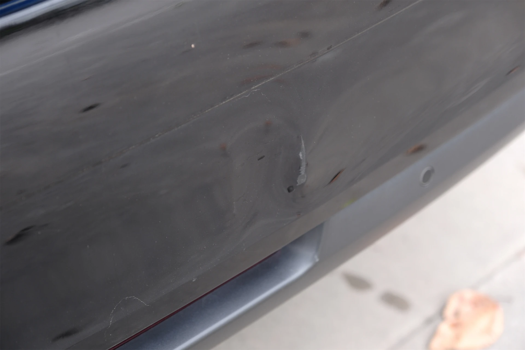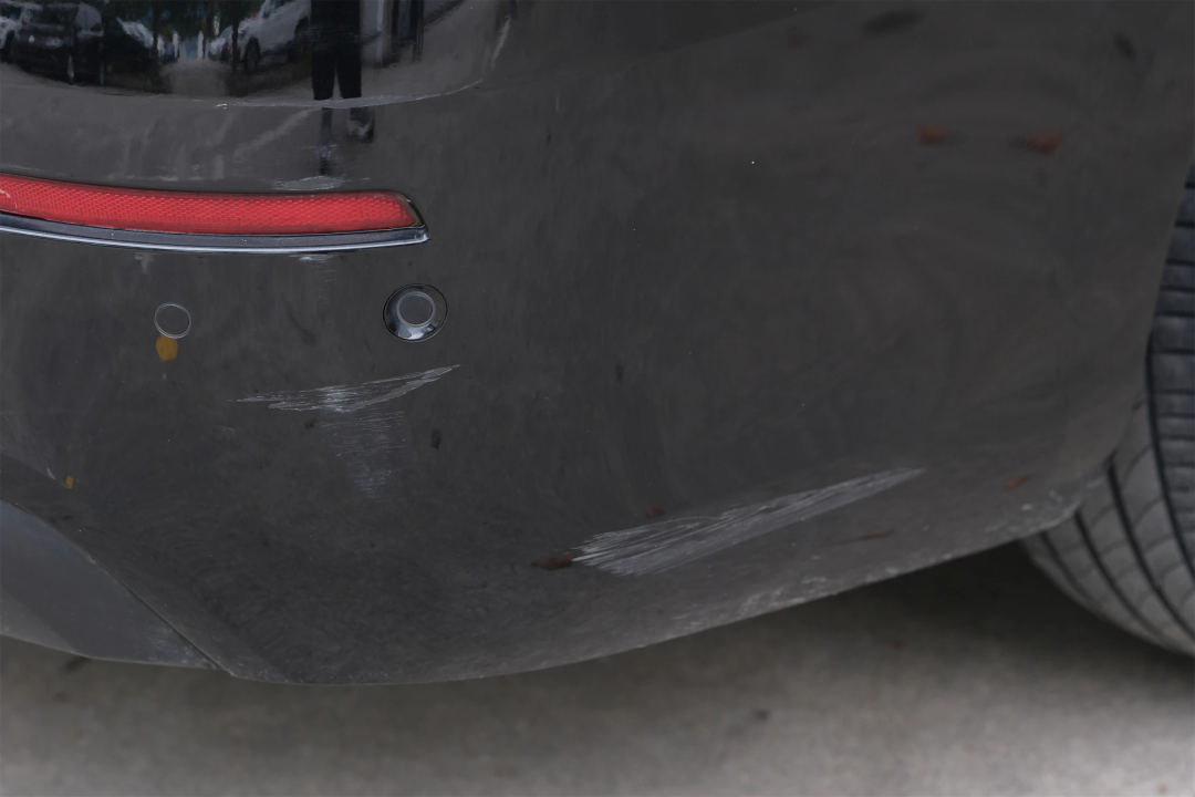 一个是后保这里有个撞痕,应该是碰到了一个圆柱形物体,估计直径在8cm左右。