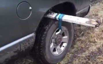 方法很简单,在轮子绑着一条最好是矩形的木头,这样做等于雪天给汽车换钉子胎,增加在泥地里的抓地力,这样轻踩油门,就可以把你的车直接带出来。