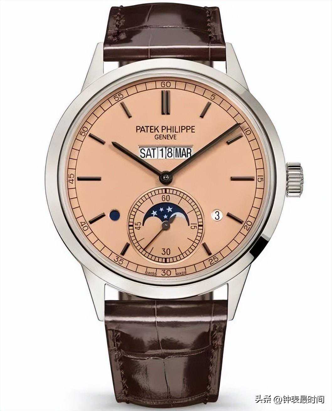 2021年百达翡丽首次推出以水平视窗显示万年历日、星、月等重要功能的5236P并列显示万年历在2024年迎来鲑鱼面改款,手表同步换上咖啡色鳄鱼皮表带,另外白金立体时标以及巴顿式指针则镀上炭灰色调,让手表的视读效果不逊于旧款。好消息是百达翡丽在新增铂金鲑鱼面之际,原有的铂金渐层蓝面还是继续保留。