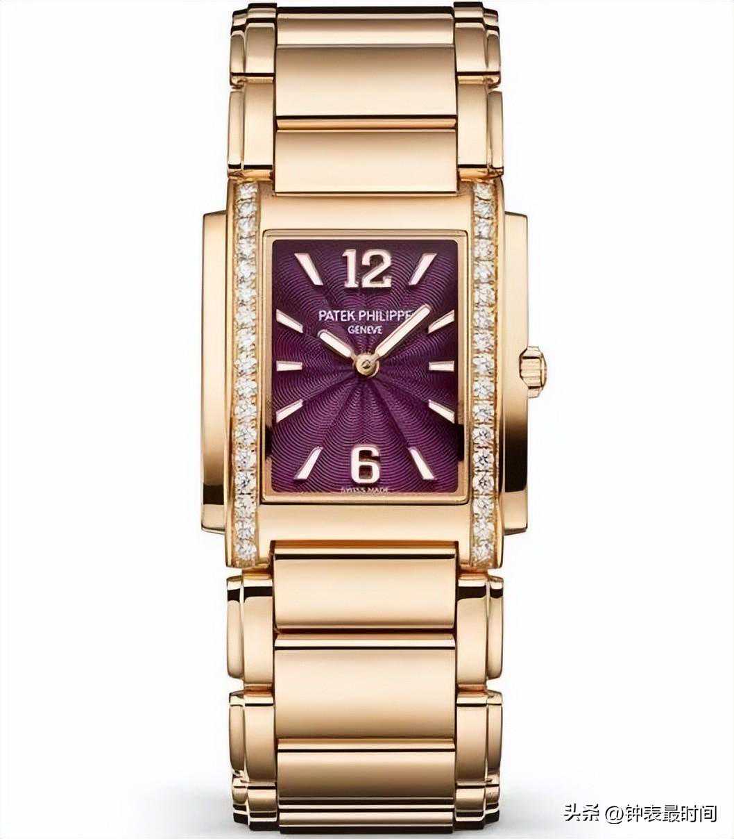 今年是Twenty~4系列诞生25周年,百达翡丽在现有的三款石英精钢款之外新增一款18K玫瑰金款4910/1201R-010用来庆祝系列的25周年,一方面也让人回忆起此系列最初采用袖口式设计被大家所认识。手表除了换上贵金属表壳外还以机刻工具在面盘刻上同心波浪纹,接着再反复涂上紫色半透明漆料,与表圈钻石、表壳和链带的贵金属光芒互相辉映。