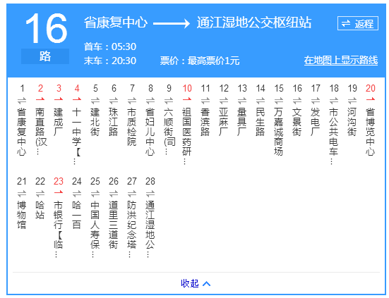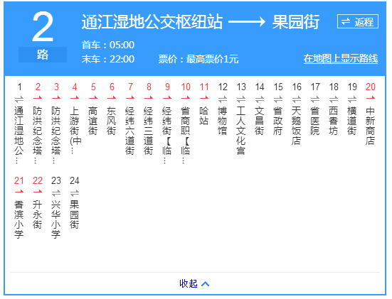 运行时间:通江湿地公交枢纽站(友谊宫)首末车:7:00-18:00