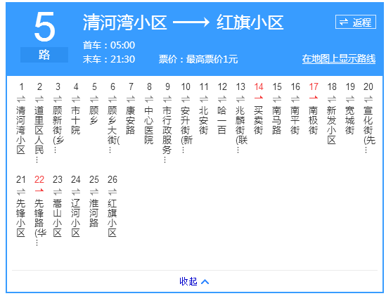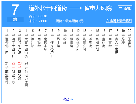 注:为配合2017年地铁建设工程施工,1路由道里发车至景阳街走向不变,由景阳街起,临时调整经景阳街、大新街、道外北十四道街恢复原走向,返回走向同上。双向取消靖宇头道街站、靖宇七道街站、靖宇十二道街站,增设景阳街站、大新街头道街站、大新街七道街站、大新街十二道街站。