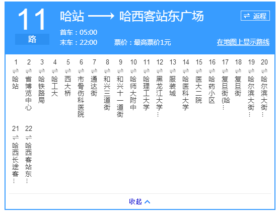 注:为配合哈站南广场改造工程的顺利进行,保证正常出行,从5月6日至8月30日,公交11路由大直街至哈站方向,经海关街至海关街松花江街口设置终点(过建筑街),返回由海关街发车,经松花江街、北京街、民益街、红军街,恢复原线路运营。