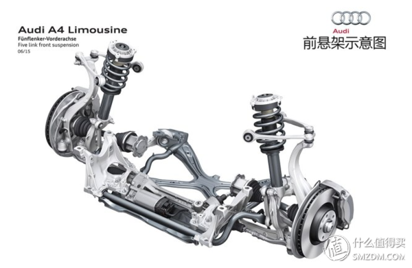 这一代A4L基于MLB(全称ModularLongitudinalMatrix)evo平台(MLB平台的升级版),相比使用多年的MBL平台,采用了更加紧凑和轻量化的设计,并重点优化空气动力学。同平台的还有Q7,宾利添越。纵置发动机布局,这样带来的好处是车辆左右负重易于平衡,而发动机运作方向与传动轴传递方向不必转变,减少了能量损耗。发动机左右空间大,有更多的空间来布置复杂的悬挂,比如双叉臂式悬架,可惜的是这次A4L没有采用双叉臂,而是他的变种---5连杆。