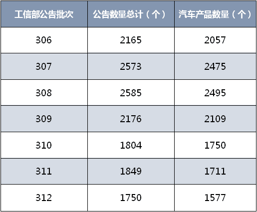 另外,笔者注意到,312批新产品是近7个月以来数量最少的,306-312批所申报的公告总数、汽车产品(含乘用车、商用车)总数如下表所示: