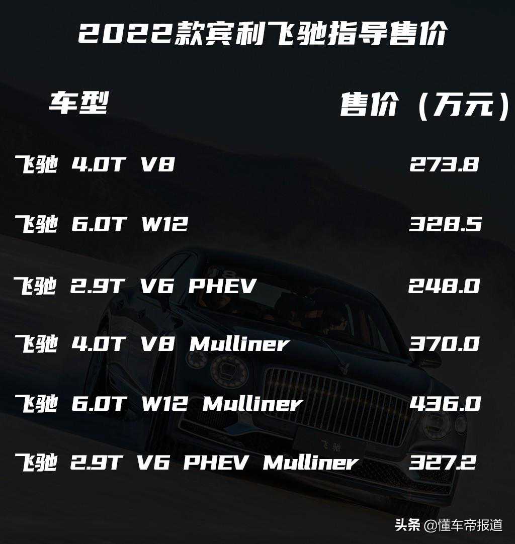 [懂车帝原创产品]日前,我们从相关渠道获悉,宾利汽车公布了旗下全系产品2022款车型的售价。其中飞驰系列共推出6款车型,售价区间248-436万元;添越共推出2款车型,售价区间269.9-313.6万元;欧陆GT系列共推出8款车型,售价区间305.5-449.8万元。