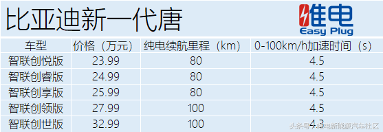 目前发布的车型有五款,分别是:智联创悦版、智联创锐版、智联创享版、智联创领版、智联创世版;售价23.99至32.99万元,本次价格区间较大,最低与最高配车型差价9万元,其中创悦、创睿、创享车型为纯电续航80km版本,创领、创世版为纯电续航100km版本;加速性能方面0-100km/h加速时间除创世版为4.3s以外,其它车型都是4.5s。