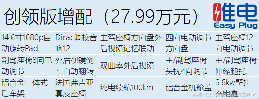 售价32.99万元,相比创领版贵5万元,增加配置多一个6.6kw壁挂充电盒,以及0-100km/h加速4.3s。该车型不建议购买,多出的充电盒属鸡肋配置,而加速4.3s在硬件一样的情况下,属程序差别,一个急速程序小5万元,老房忽感肾疼。