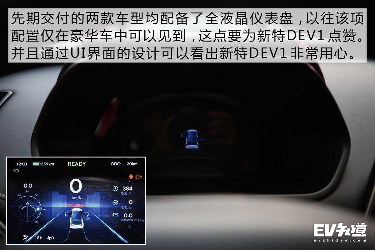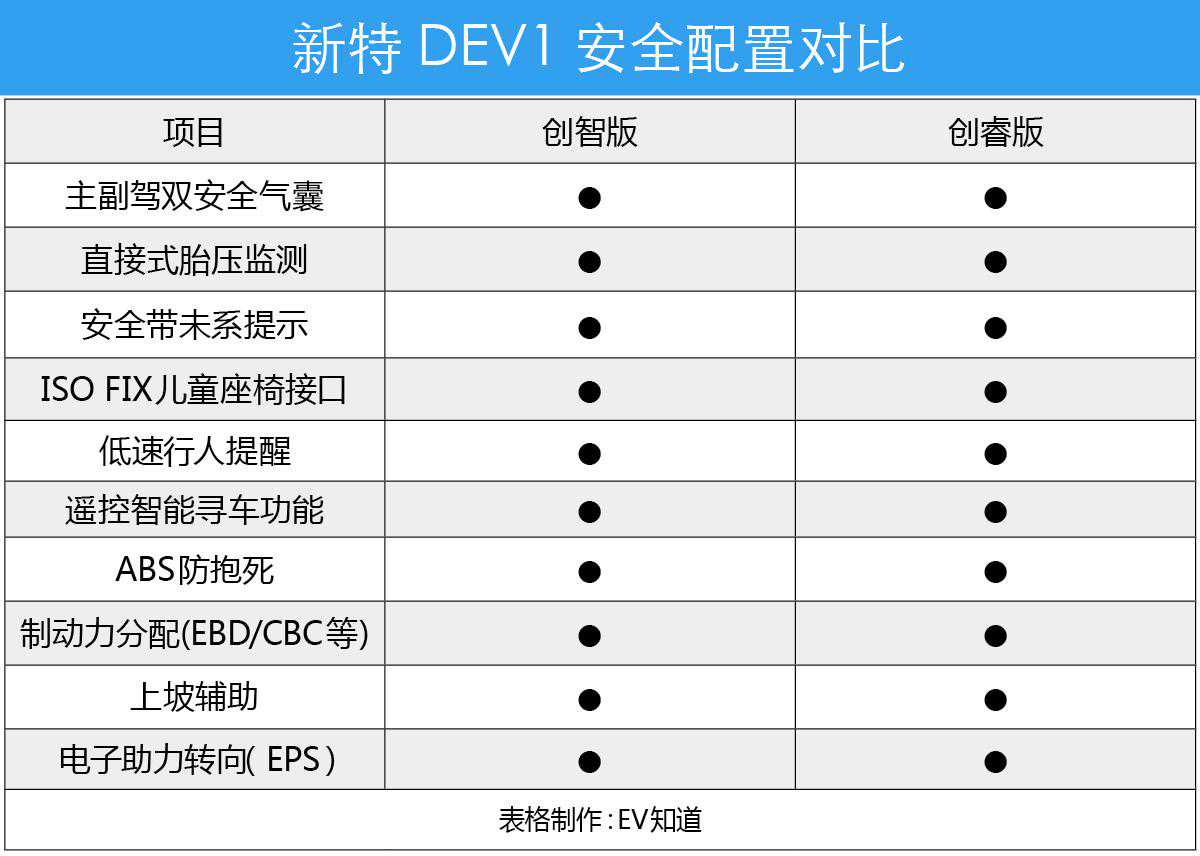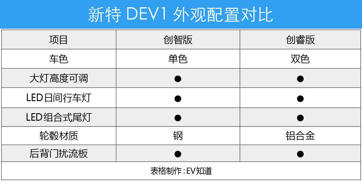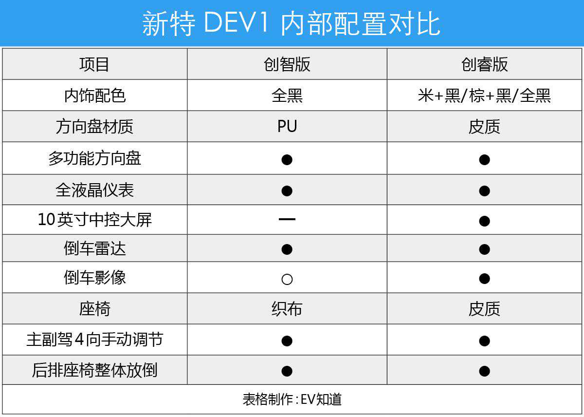 新特DEV1共推出4个配置版本,不过在今年内将率先交付创智版和创睿版车型,所以今天我们就根据这两款车型展开对比。