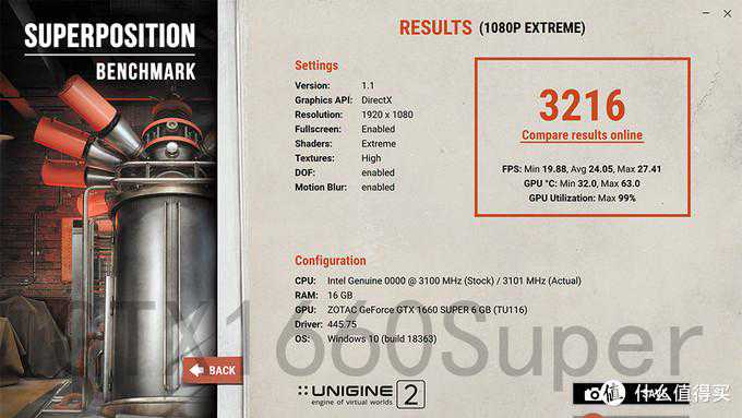 ▼UNIGINESUPERPOSITION的1080PEXTREME,截图为GTX1660Super数据。