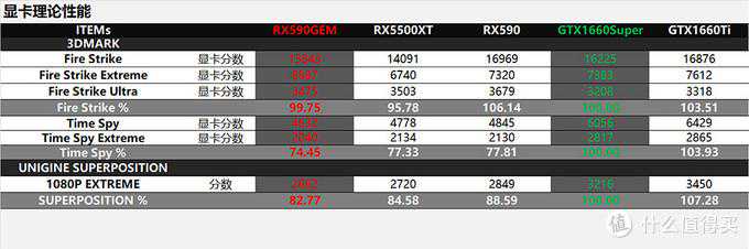 以GTX1660Super为100%计,3DMarkFireStrike(DX11)中,A卡阵营与N卡阵营差距不大,RX590还要高于两款N卡;TimeSpy(DX12)中N卡完成反超,GTX1660Super领先A卡大概22~25%;UNIGINESUPERPOSITION测试中,GTX1660Super领先A卡三张显卡大概在11~17%。另外N家的两款显卡差距只有4~7%。