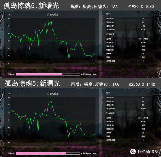 ▼测试下实际的游戏,DX11游戏-孤岛惊魂5:新曙光的BenchMarch,GTX1660Super在极高画质下,1080p分辨率平均帧数达到了87fps,1440p(2k)分辨率平均帧数达到了64fps,非常流畅。