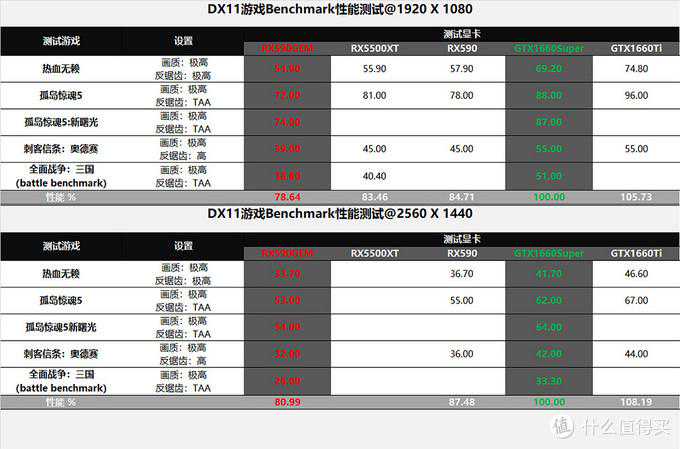 ▼所测游戏都是最高画质下。GTX1660Super在1080p分辨率下领先3款A卡15~21%;在1440p(2k)分辨率下领先幅度为13~19%(由于RX5500XT是4G版,所以没作2k分辨率的测试);GTX1660Super和GTX1660Ti的差距为6~8%。