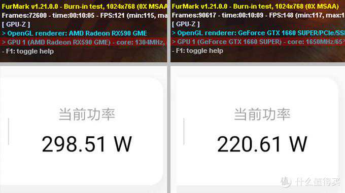 ▼RX590GME在烤机10分钟后帧数降到1304MHz(最高频率:1460MHz),整个平台功耗接近300w;GTX1660Super则为1650MHz(最高频率:~1900MHz),功耗只有220w。差距大的原因:(1)北极星功耗确实大;(2)N卡烤机时降频幅度大。