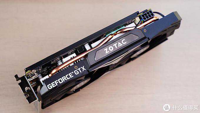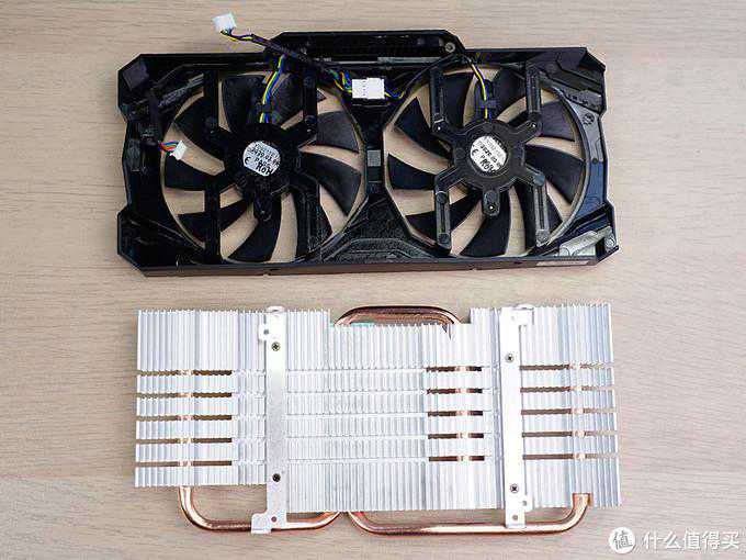 ▼拆解后可以看到显卡采用了双热管,热管直触显卡核心,两个热管一个成S形,一个为U型,显然S形的热管要比常规热长很多,提高了换热效果。另外显存以及mosfet上都覆盖有导热垫,与散热器贴合来达到散热的目的。