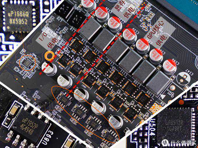 ▼PRO是左侧供电,看似像6+2供电,其实为4相GPU核心供电加上2相显存供电;最上面的两组(1R0电感与GS9216)像是显存供电,但这实际上是I/O供电。核心供电PWM控制为uP9512R芯片(PCB背面);显存供电PWM控制为uP1666Q芯片。