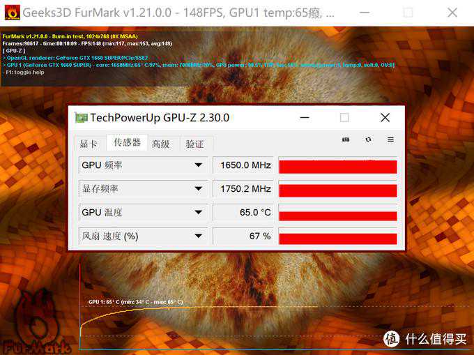 ▼运行了FurMark10分钟之后,索泰GTX1660Super6GD6XGAMINGOCPRO温度到达了65℃,频率保持在1650MHz,满载时风扇转速为67%,在机箱里的噪音还能接受。