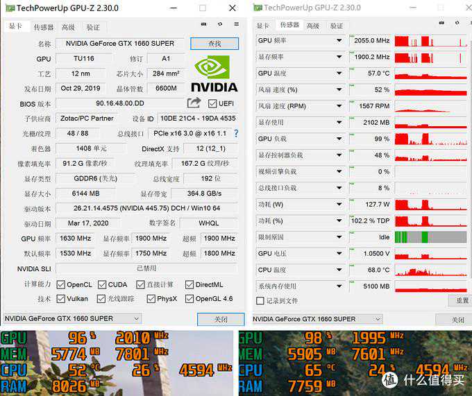▼GTX1660SuperX-GAMINGOCPRO频率为1530MHz,BOOST频率为1800MHz,比公版的1785MHz稍高一点,在3Dmark测试中最高达到了1965Mhz;游戏测试高频在1920MHz左右,低频在1890MHz左右。