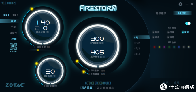 ▼索泰显卡的RGB灯效可以在FIRESTORM中设置,光效不算太丰富,只有几种。