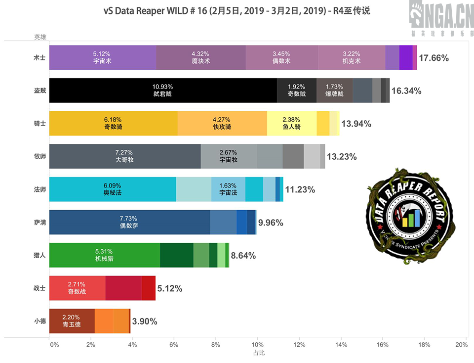 术士的出场率有所提升,成为了4-传说分段的最热门职业。宇宙术依然是最为主流的术士形态,而紧随其后的则是魔块术,偶数术,以及新近打磨完成的机克术。