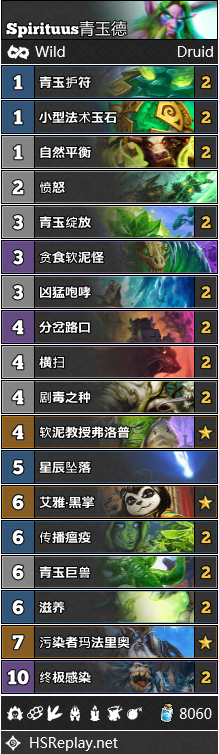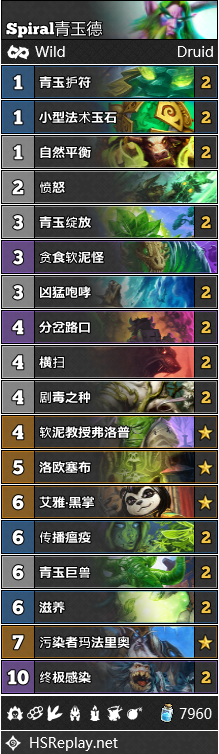 目前青玉德构筑的一大趋势,便是玩家们纷纷带上了自然平衡。这张法术既能瞬间产生一大波疲劳伤害,也能被用来爆掉对手的核心卡牌,因此有时可以起到出奇制胜的效果。比方说,在海君贼发动不稳定元素抽空牌库之后,打出自然平衡时常可以让对手直接爆炸。Spiral带着自己的青玉德构筑参加了2019年的狂野公开赛,而Spirituus在三月也使用青玉德在欧服成功登顶。