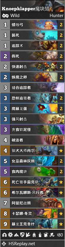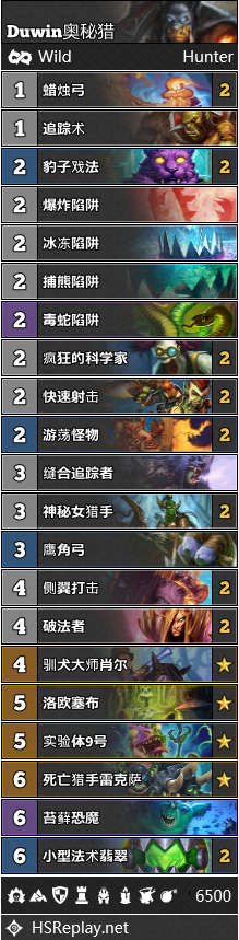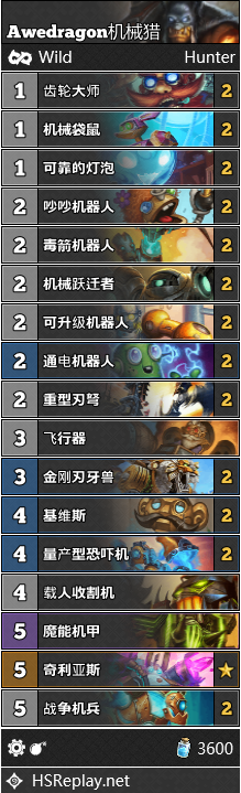 中速猎虽然如今在标准环境之中十分流行,但是到了狂野,这一卡组还只是处于襁褓期。在对狂野公开赛的展望之中,许多标准玩家都希望能把这一卡组引入狂野。Jakaso27的构筑目前最为流行,许多玩家都使用这套构筑打到了传说高位。