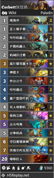 快攻骑也同样进入了T1,成为了骑士三驾马车中的最后一员。原版的快攻骑构筑已经十分强力,而这里我们也搬运了另一种不太一样的套路,那便是Corbett的登顶构筑。他的构筑基于一整套奥秘骑的体系,同时还加入了坎格尔的无尽大军。