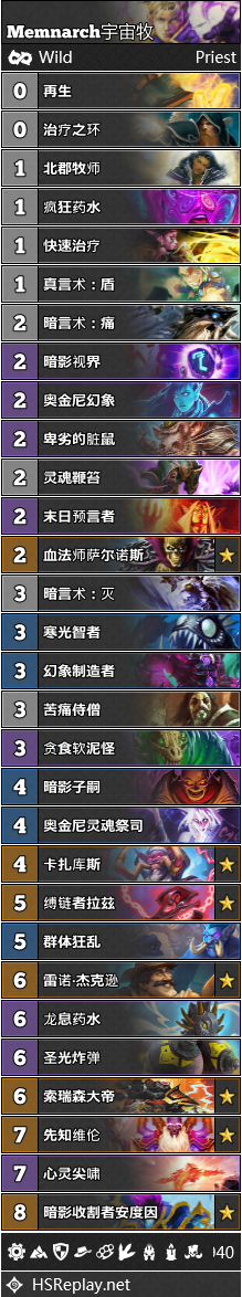 宇宙牧虽然号称最强宇宙卡组,但是实际上他在狂野环境中混的并不怎么样。在过去,宇宙牧以遍布天梯的偶数萨为食粮,每餐都可以吃到全饱。而如今放眼望去,天梯中看到的各种卡组似乎都不太好吃,因此饥肠辘辘的宇宙牧只能赶上T3的末班车。与大哥牧相似,宇宙牧也成为了海君贼和奥秘法崛起的受害者。然而与大哥牧不同的是,宇宙牧无法依靠捕食术士来扭转颓势。就目前而言,宇宙牧正处于下行态势。本月初Memnarch使用下面搬运的这套卡组打到了传说第5。