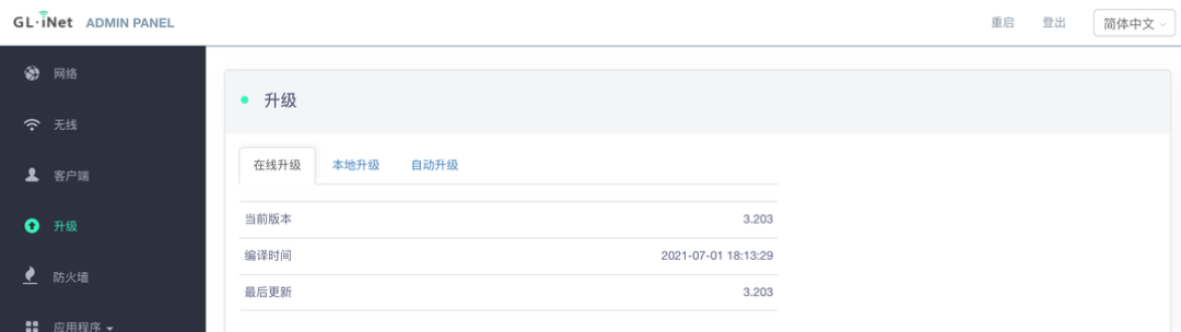 『升级』处提供了在线升级、本地升级以及自动升级的功能,可以方便及时地更新固件,解决遇到的BUG。